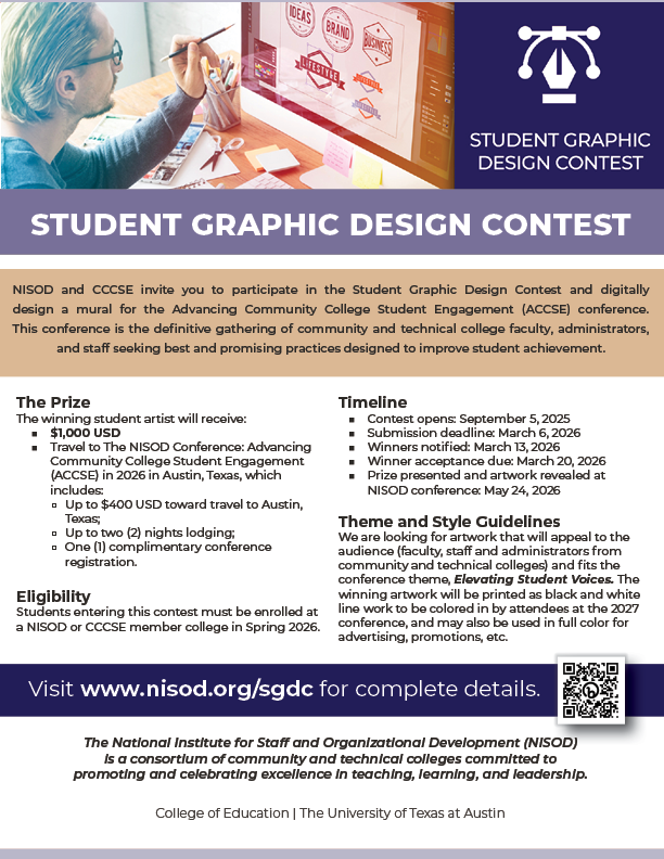 NISOD and CCCSE invite you to participate in the Student Graphic Design Contest and digitally design a mural for the Advancing Community College Student Engagement (ACCSE) conference. This conference is the definitive gathering of community and technical college faculty, administrators, and staff seeking best and promising practices designed to improve student achievement.