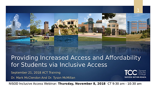 Co-chairs of the Tarrant County College Inclusive Access Project, Dr. Mark McClendon and Dr. Tyson McMillan, discuss their affordability program called TCC Plus, which launched in Spring 2018. TCC Plus is student focused, faculty driven, and administrative supported. Dr. McClendon shares his perspective from the administrative seat and Dr. McMillan, as co-chair and a faculty member in the program, shares the impact he has seen in the classroom. The webinar facilitators take you through their journey to Inclusive Access, how they implemented the program, share results from the pilot, as well as how they plan to grow exponentially in the upcoming academic semesters.